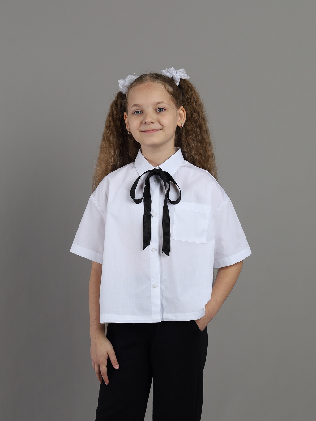 Укороченная оверсайз блузка из хлопка в изящную полоску, свободного силуэта с отложным воротником и короткими рукавами. Застёжка центральная на планку с пуговицами. Спереди карман. Декорирована бантиком из репсовой ленты.Дополнительно