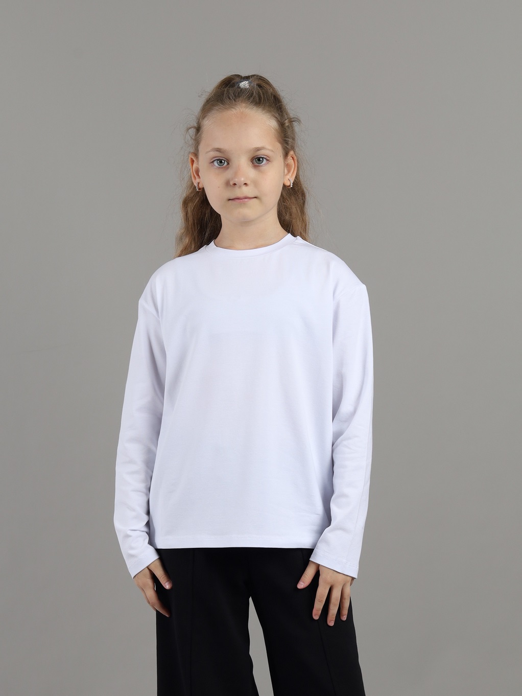 Джемпер свободного силуэта для девочки со спущенным плечом и длинными рукавами. Воротник из основного полотна. На спинке декоративная жаккардовая этикетка.Дополнительно