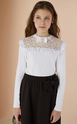 Джемпер для девочки с длинным рукавом. Выполнена из хлопкового трикотажа найвысшего качества пенье. Застежка-капелька на спинке на пуговицу. Дополняет образ рюши и вставки из кружева. Украшена съемным бантом с жемчужинамиДополнительно
