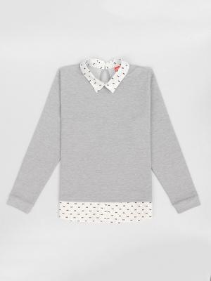 Джемпер с длинными рукавами из футер без начеса. Горловина круглая, обработана отложным воротником из сорочечной ткани. На спинке обработана застежка "капелька" на пуговичку. Рукава с манжетами по низу. Нижние срезы переда и спинки обработаны притачными деталями из сорочечной ткани, создающими ощущение двухслойного изделия.Дополнительно