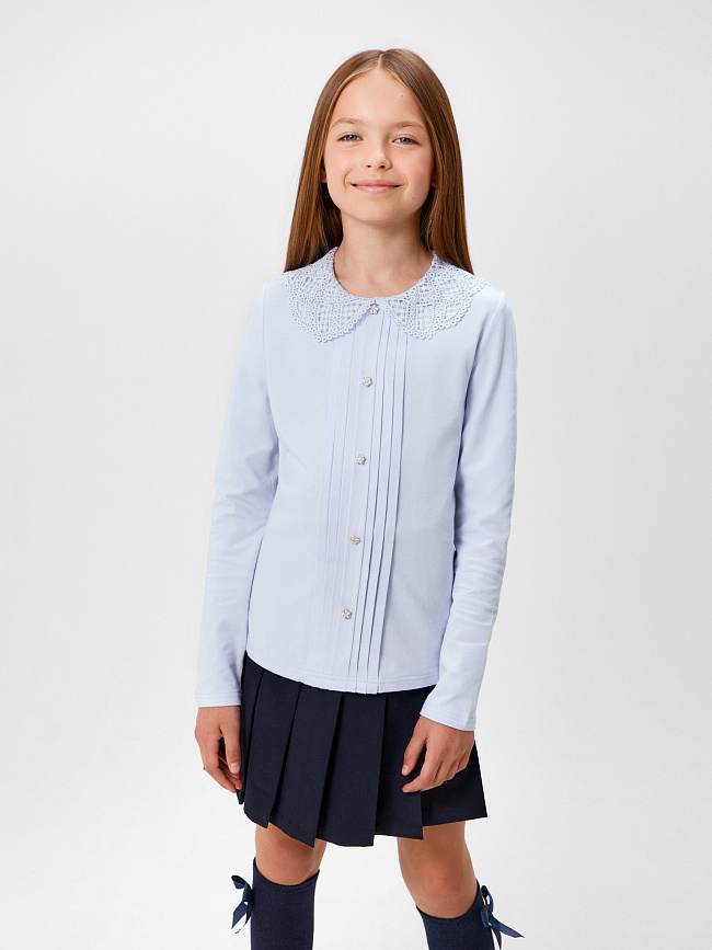 Школьная блузка с воротничком для девочки. Мягкий смесовый хлопок гипоаллергенен и прост в уходе. Спереди отделка в виде плиссе с декоративными пуговицами в виде цветочков. На спинке вырез-капелька и застежка на пуговицу. Кружевной отложной воротничок несъёмный. Рукава без манжет не сковывают движений. Комбинируйте блузку с брюками и юбками в деловом стиле для завершения образа.Дополнительно
