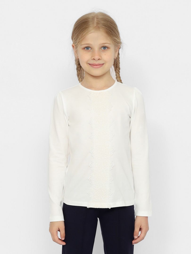 Джемпер для девочки с длинными рукавами. Полочка декорирована кружевом. Рукава со сборкой по окату. Горловина окантована.Дополнительно