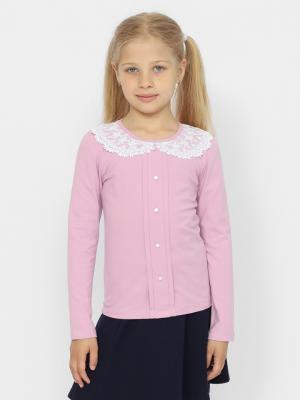 Джемпер для девочки с длинными рукавами и с отложным кружевным воротником. Рукава со сборкой по окату. Полочка с иммитацией застежки на пуговицы и складками. Сзади застежка на пуговицу.Дополнительно