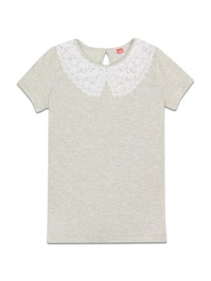 Джемпер для девочки с короткими рукавами. Горловина круглая, оформлена декоративным воротником и бантиком. В верхней части спинки обработана застежка "капелька".Дополнительно