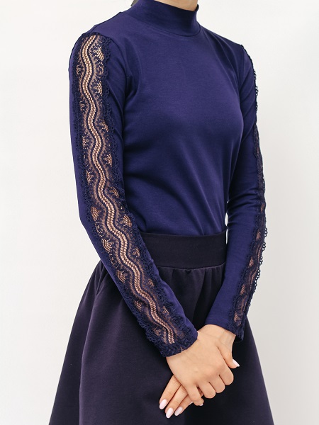 Водолазка для девочки длинными рукавами и воротником-стойкой. Рукава со вставками из эластичного кружева.Дополнительно