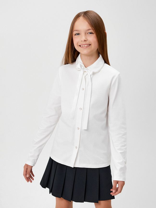 Белая блузка для девочки. Застегивается на кнопки, декорированные перламутровыми половинками бусин. На воротнике съемная белая лента, которую можно завязать на бант или использовать как украшение для волос. Отложной круглый воротник декорирован по краю белыми бусинами. Длинные рукава без манжет не сковывают движений. Мягкий смесовый хлопок приятен к телу и позволяет коже дышать. Блузка станет базовой деталью делового гардероба и составит стильный лук с юбкой в складку или деловыми брюками.Дополнительно