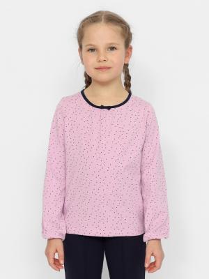 Джемпер для девочки с длинными рукавами из набивной кулирки. Низ рукава и горловина обработаны контрастной бейкой. Сзади застежка на пуговицу.Дополнительно