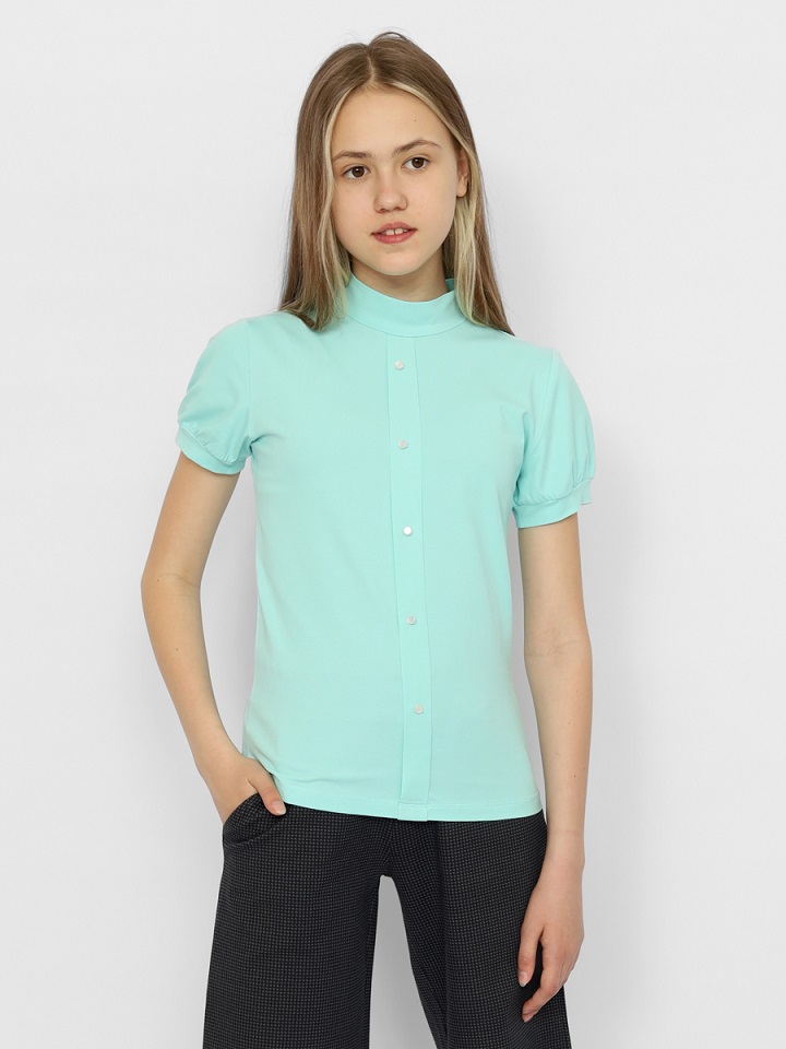 Водолазка для девочки с короткими рукавами-фонариками и воротником-стойкой. Рукава с манжетами. Полочка с иммитацией застежки на пуговицы и складками.Дополнительно