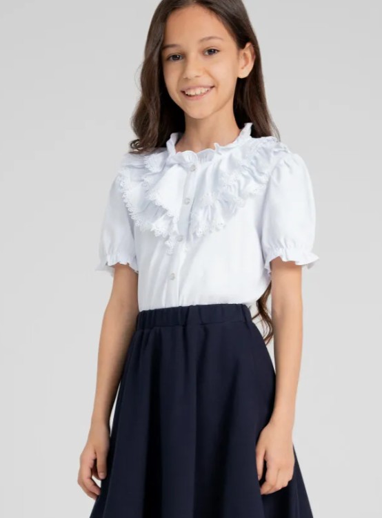 Блузка трикотажная полуприлегающего силуэта. Декорирована воланами с кружевом. Эластичная резинка по низу рукавов. Застежка на кнопки. Высокое содержание хлопка 95%. Благодаря наличию эластана в составе ткани, изделие проще в уходе и держит форму.Дополнительно