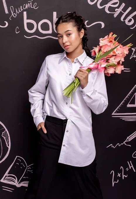 Блузка для девочки с длинными рукавами и термотрансфером на воротнике. Застежка на петли пуговицыДополнительно