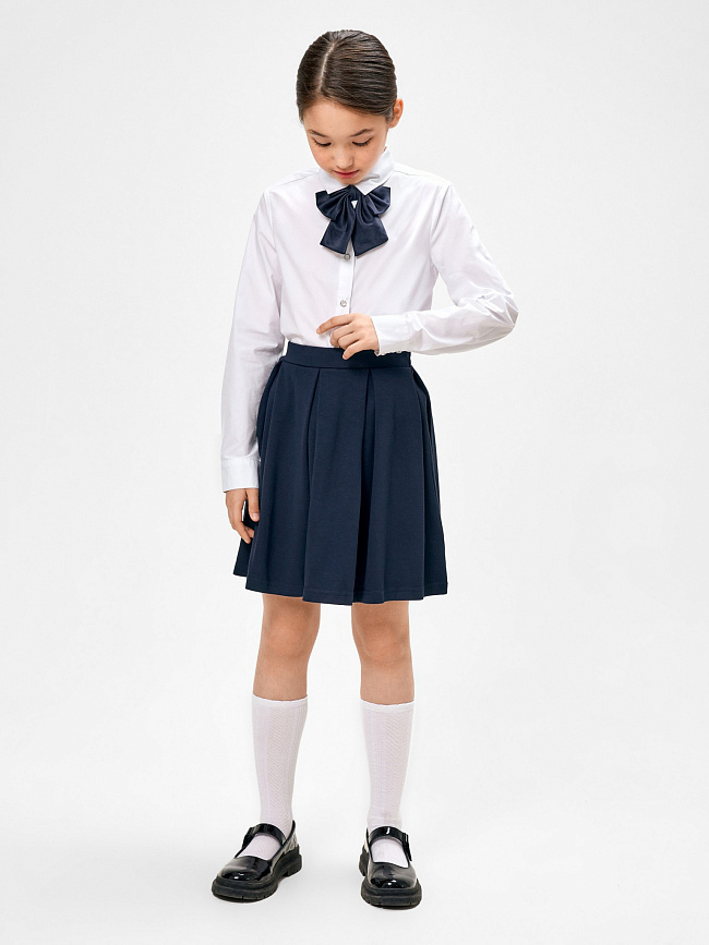 Школьная юбка для девочки. Выполнена из вискозного трикотажа, который отличается износостойкостью и яркостью цвета. Юбка с широкими бантовыми складками. Пояс на резинке позволяет отрегулировать изделие по линии талии. Комбинируйте юбку в деловых образах с рубашками и блузами.Дополнительно