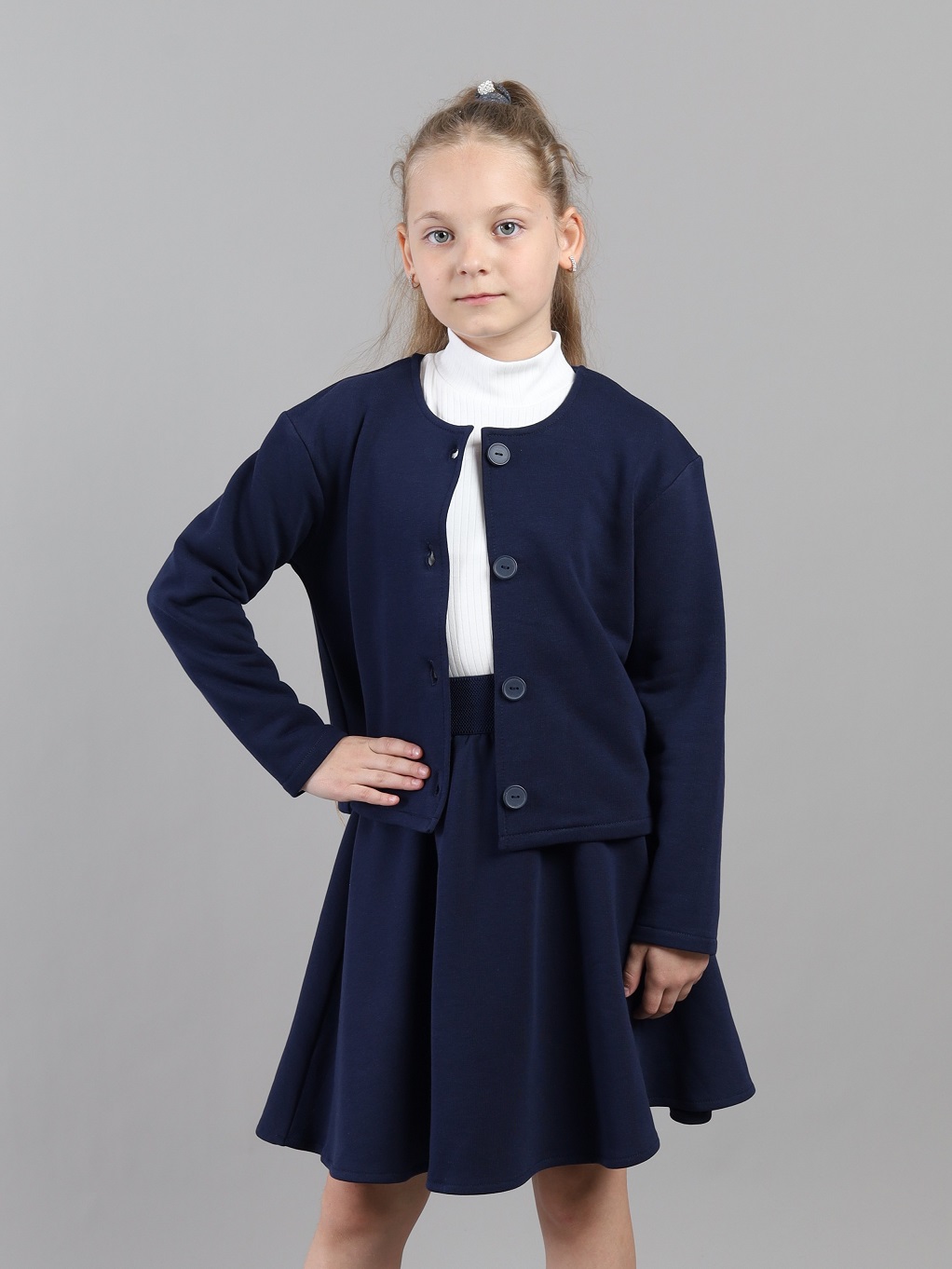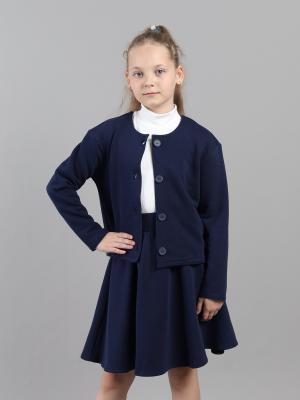 Жакет прямого кроя из мягкого футера — тот мастхэв, который можно носить самыми разными способами, не ограничивая возможности стиля! Свободный крой с заниженной линией плеча не сковывает движения, позволяя ребенку быть активным. Спереди застежка на пуговицы.Жакет сочетается с водолазками, джемперами и блузками из коллекции. Подходит под все поясные изделия - юбки и брюки.Дополнительно
