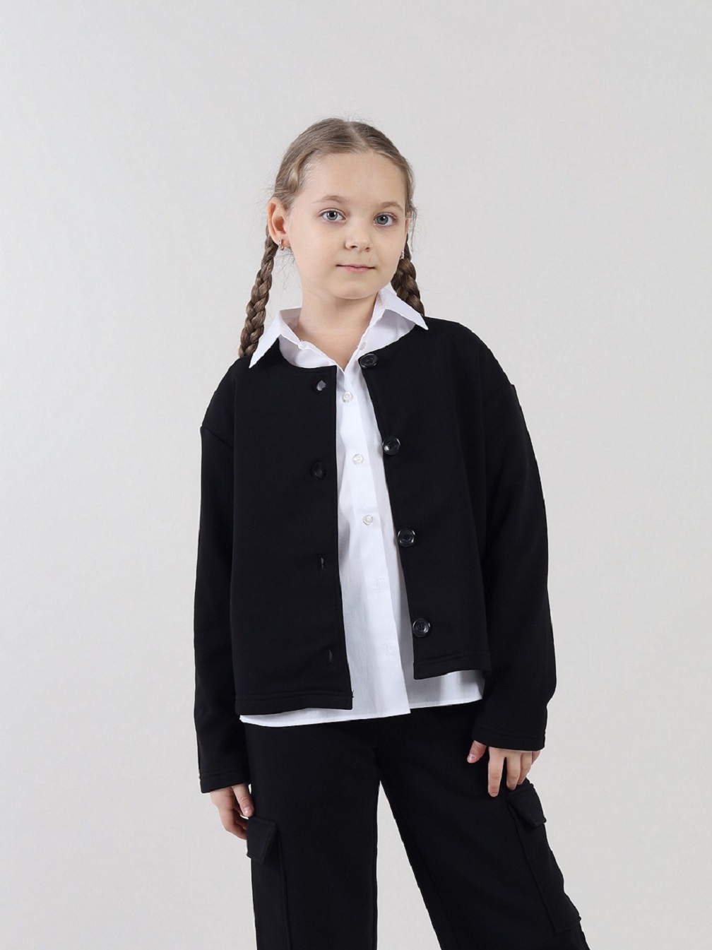 Жакет прямого кроя из мягкого футера — тот мастхэв, который можно носить самыми разными способами, не ограничивая возможности стиля! Свободный крой с заниженной линией плеча не сковывает движения, позволяя ребенку быть активным. Спереди застежка на пуговицы.Жакет сочетается с водолазками, джемперами и блузками из коллекции. Подходит под все поясные изделия - юбки и брюки.Дополнительно
