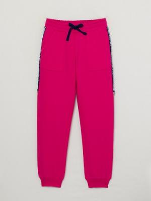 Брюки для девочки на притачном поясе из основного полотна, с накладными карманами, на эластичных манжетах. В пояс всталена резинка и функциональный шнур. По боковым швам брюк сверху до уровня чуть выше колена настрочена принтованная экстрафорная тесьма, на концах которой закреплены металлические кольца. Шнур в поясе и экстрафорная тесьма отделочного цвета.Дополнительно