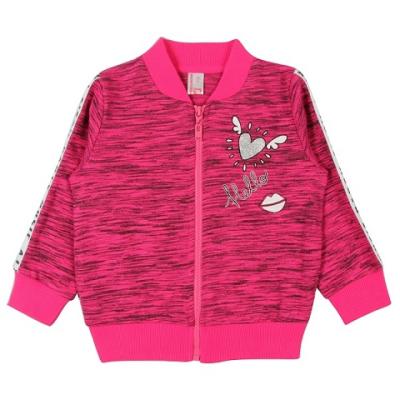 Куртка из футера "ложный меланж" с длинными рукавами и центральной застежкой по переду на замок-молнию. Воротник-стойка. Рукава втачные, с манжетами по низу. Нижний срез куртки обработан притачным поясом. Воротник, манжеты и пояс выполнены из полотна с эластаном. Левая полочка декорирована принтом с использованием краски с блеском.Дополнительно