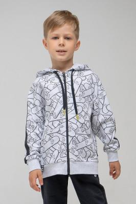 Удлинённая куртка с тонким капюшоном из петельчатого футера с набивным рисунком. Застёгивается на молнию. Длинные втачные рукава украшены контрастными лентами. Мягкие пояс и манжеты выполнены из эластичного материала с добавлением лайкры. На животе удобные вместительные карманы.Дополнительно