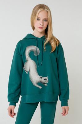 Однотонная толстовка с двойным капюшоном для девочки. Сшита из петельчатого футера трёхнитки. Капюшон утягивается при помощи шнурка. На рукавах - эластичные манжеты. Внизу - мягкий пояс. Украшена принтом с изображением пушистого лесного зверька.Дополнительно