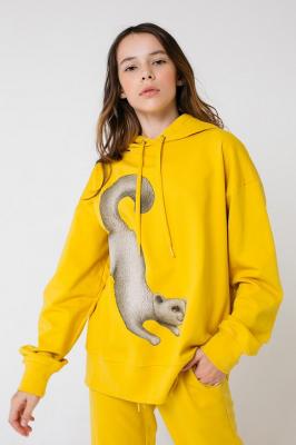 Однотонная толстовка с двойным капюшоном для девочки. Сшита из петельчатого футера трёхнитки. Капюшон утягивается при помощи шнурка. На рукавах - эластичные манжеты. Внизу - мягкий пояс. Украшена принтом с изображением пушистого лесного зверька.Дополнительно