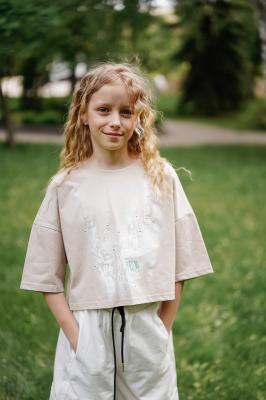 Эта футболка от бренда DELORAS, предназначенная для девочек подросткового возраста, является частью летней коллекции и прекрасно сочетает в себе стиль и комфорт. Изготовленная из мягкого хлопкового трикотажа, она обеспечивает прекрасную воздухопроницаемость и ощущение легкости, что особенно важно в теплое время года.Футболка выполнена в стиле оверсайз, что придаёт ей модный и современный вид. Свободный прямой крой со спущенной линией плеча создает непринужденный и молодежный образ. Круглый вырез горловины в рубчик и короткий рукав дополняют дизайн, делая эту модель универсальной и подходящей для разных повседневных ситуаций.
