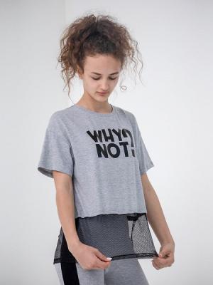 Футболка для девочки свободного силуэта со спущенным плечом, короткими рукавами и отделкой из сетки. Горловина круглая, обработана воротником из полотна с эластаном. Перед футболки декорирован принтом с использованием красок с блеском.Дополнительно