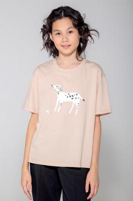 Трикотажная футболка прямого силуэта из 100% натурального хлопка. У изделия спущенные плечи. Оригинальный принт выполнен из стойких текстильных красителей. Футболка сохраняет цвет и форму после многократных стирок.Дополнительно