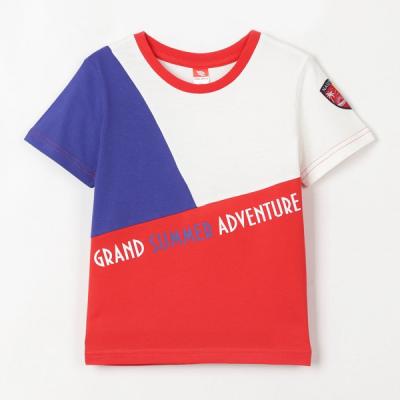 Футболка для мальчика с короткими рукавами и ассиметричными разрезами переда и спинки. Горловина круглая, обработана воротником из полотна с эластаном. Нижняя деталь переда декорирована принтом. На левый рукав настрочена жаккардовая этикетка.Дополнительно