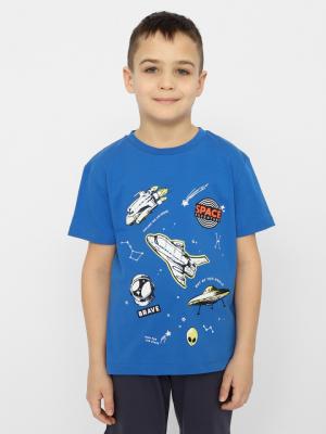 Футболка для мальчика из кулирной глади. Горловина обработана притачной бейкой из рибаны с эластаном. Перед декорирован принтом "Космос".Дополнительно