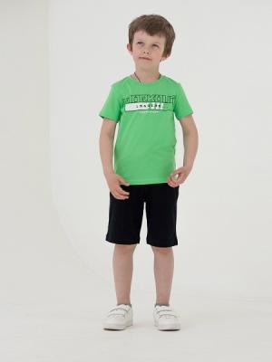 Футболка для мальчика с короткими втачными рукавами. Горловина круглая, обработана воротником из полотна с эластаном. Перед футболки декорирован принтом.Дополнительно