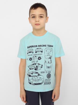 Футболка для мальчика из кулирной глади. Горловина обработана притачной бейкой из рибаны с эластаном. Перед декорирован принтом "Гоночный автомобиль".Дополнительно