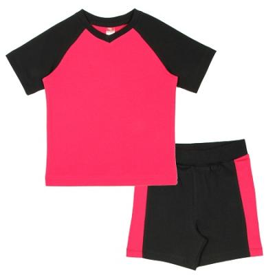 Комплект из футболки и шорт выполнен из полотна двух цветов. Футболка с коротким рукавом-реглан из кулирного полотна. Вырез горловины V-образный, обработан притачной бейкой из рибаны с эластаном. Шорты из кулирной глади повышенной плотности. Верх шорт обработан притачным поясом из рибаны с эластаном. Боковые вставки в цвет футболки. Длина шорт до колена.Дополнительно
