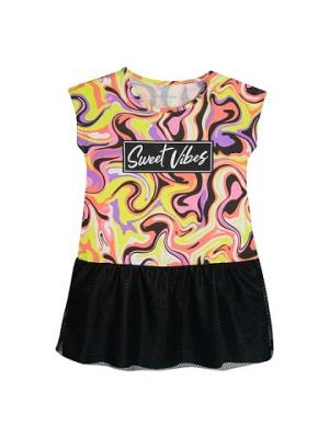 Платье для девочки отрезное ниже линии талии, со спущенным плечом, без рукава. Юбка двухслойная. Верхний слой выполнен из мягкой прозрачной сетки. Перед платья декорирован принтом, с использованием красок с блеском.Дополнительно