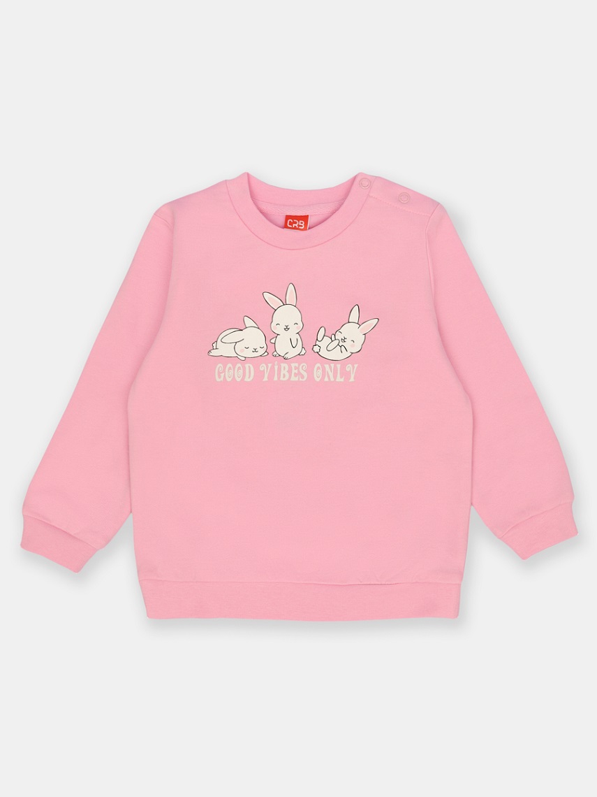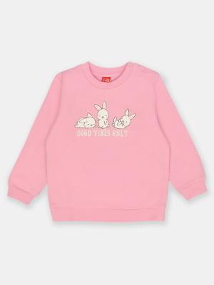 Джемпер для девочки из мягкого футера с начесом. Горловина круглая, оформлена кашкорсе. На плече застежка на кнопки. На полочке выполнена шелкография в виде трех забавных кроликов и надпись - только хорошие флюиды.Дополнительно