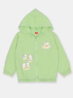 Курточка для девочки с капюшоном из мягкого футера с начесом. Застежка на молнию. Пуллер на молнии в виде ромашки. Низ рукавов и низ изделиня на резинке. На полочках шелкография в виде забавных кроликов, сидящих на ромашках.Дополнительно