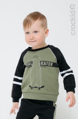 Тёплый джемпер для мальчика с длинными рукавами-реглан. Сшит из футера с начёсом. Украшен крупным принтом на груди и контрастной лентой на рукавах. Для удобства при одевании застёгивается на кнопки на спинке.Дополнительно