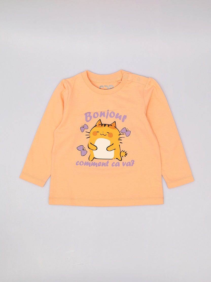 Джемпер для девочки свободного силуэта из мягкого трикотажа. Горловина круглая, оформлена рибаной, по плечу застежка на кнопки. На полочке выполнена шелкография - кошка с бабочками. Надпись на французском - Привет, как дела?.Дополнительно