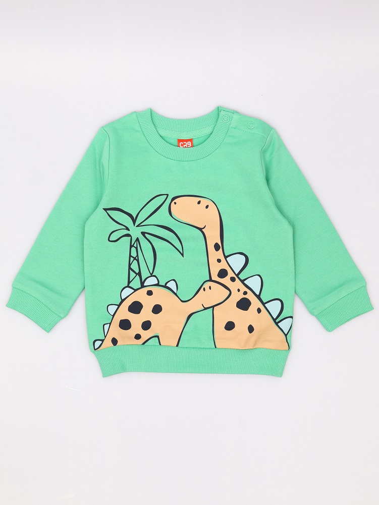 Джемпер для мальчика свободного силуэта из мягкого трикотажа. Горловина круглая, оформлена кашкорсе, по плечу застежка на кнопки. На полочке выполнена шелкография - динозавры.Дополнительно