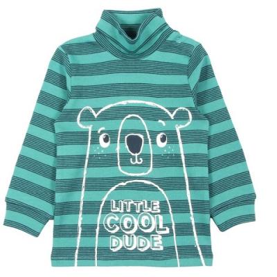 Водолазка с длинным рукавом, выполнена из мягкой рибаны в вязанную из крашеной пряжи полоску. Воротник-стойка с отворотом и застежкой на кнопки, переходящей в плечевой шов. Рукава длинные с манжетми по низу. Перед декорирован принтом.Дополнительно