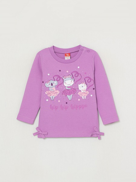 Джемпер из гладкокрашенного интерлока. По горловине притачная бейка из рибаны с эластаном в цвет основного полотна. На плече застёжка на кнопки. Переход спинки на перед образует рельефные швы, низ которых оформлен бантиками из экстрафорной ленты. Перед оформлен принтом.Дополнительно