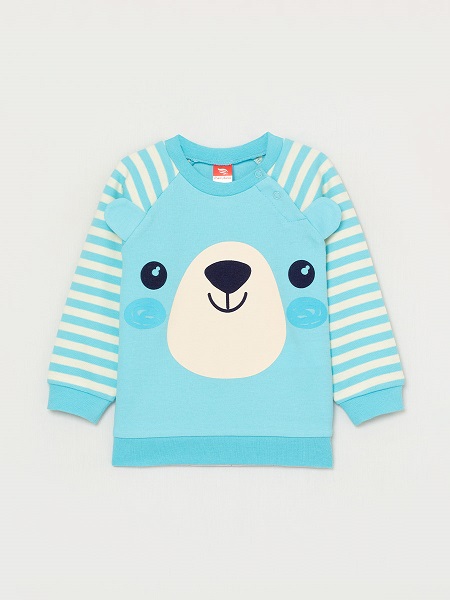 Джемпер из гладкокрашенного интерлока с полосатыми рукавами-реглан. Притачная бейка горловины, манжеты и пояс из рибаны с эластаном в цвет основного полотна. Перед оформлен принтом в виде мордочки и ушками из основного полотна, закреплёнными в швах втачивания рукавов. Спереди, в шве втачивания рукава застёжка на кнопки.Дополнительно