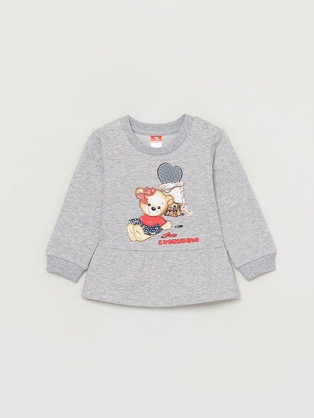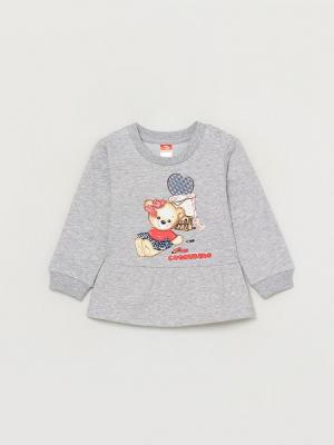 Джемпер из гладкого футера с начёсом. Нижняя отрезная часть присборена по шву притачивания. Манжеты рукавов и бейка горловины - из кашкорсе с эластаном. На плече застёжка на 2 кнопки. Перед оформлен милым принтом.Дополнительно