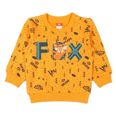 Джемпер с длинным рукавом на манжете, притачным поясом и застежкой на кнопки в плечевом шве, выполнен из набивного футера с начесом. Горловина круглая, обработана притачной бейкой, по ростку настрочена экстрафорная лента. Перед декорирован веселым принтом.Дополнительно