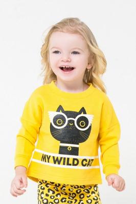 Однотонный джемпер для девочки из футера с начесом. Длинные рукава со спущенным плечом. Эластичные манжеты и горловина. В области спинки предусмотрена застежка на кнопки. Спинка, скругленная по низу, длиннее переда. Спереди принт.Дополнительно