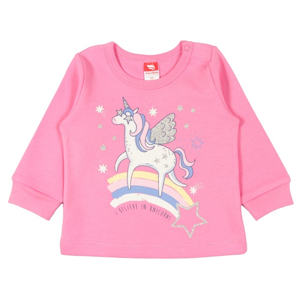 Джемпер с длинным рукавом и застежкой на кнопки в плечевом шве из мягкого интерлока. Горловина круглая, окантована бейкой из основного полотна. По низу рукава притачная манжета из основного полотна. Перед декорирован милым принтом.Дополнительно