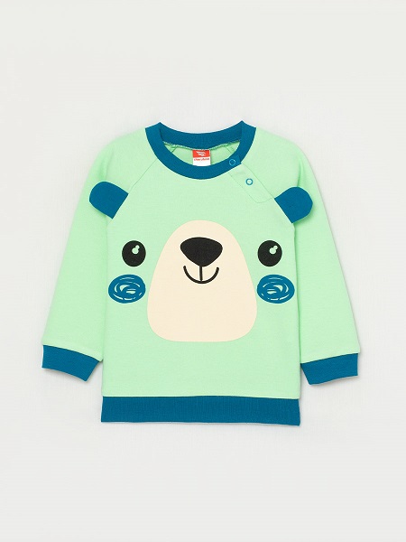 Джемпер из гладкокрашенного интерлока с полосатыми рукавами-реглан. Притачная бейка горловины, манжеты и пояс из рибаны с эластаном в цвет основного полотна. Перед оформлен принтом в виде мордочки и ушками из основного полотна, закреплёнными в швах втачивания рукавов. Спереди, в шве втачивания рукава застёжка на кнопки.Дополнительно