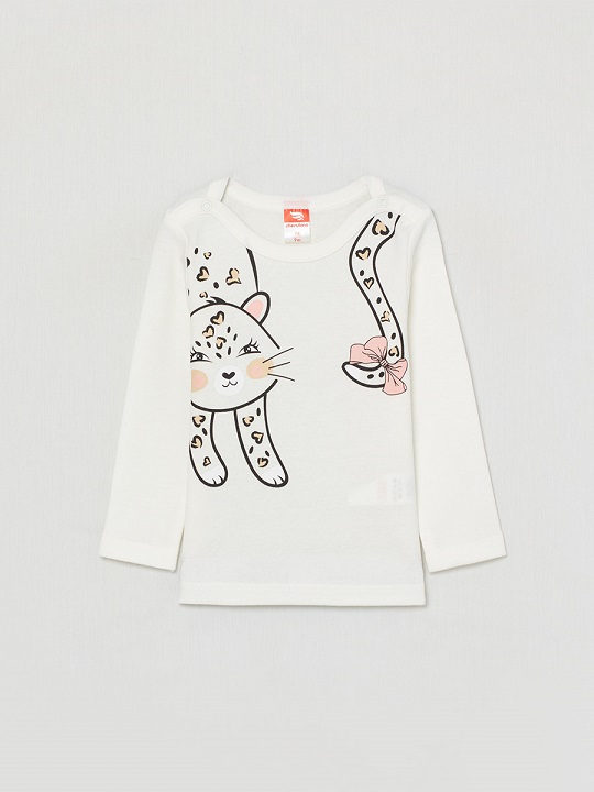 Джемпер из гладкокрашенной рибаны с застежкой на кнопки с двух сторон горловины. Горловина и плечевые срезы окантованы бейкой из основного полотна. Низ джемпера и рукавов обработан плоским швом вподгибку. Перед оформлен принтом.Дополнительно