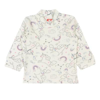Водолазка с длинным рукавом из мягкого интерлока с набивкой. По низу рукава притачная манжета. Воротник-стойка без отворота. В плечевом шве и на воротнике обработана застежка на кнопки.Дополнительно