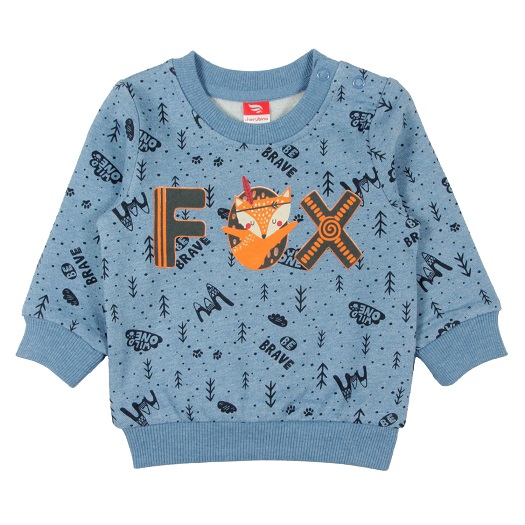 Джемпер с длинным рукавом на манжете, притачным поясом и застежкой на кнопки в плечевом шве, выполнен из набивного футера с начесом. Горловина круглая, обработана притачной бейкой, по ростку настрочена экстрафорная лента. Перед декорирован веселым принтом.Дополнительно
