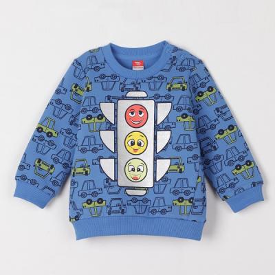 Джемпер для мальчика с длинными рукавами. Горловина круглая, обработана притачной планкой. В плечевом шве обработана застежка. Рукава втачные с манжетами по низу. Нижние срезы джемпера обработаны притачным поясом. Пояс, манжеты и воротник выполнены из полотна с эластаном. Перед джемпера декорирован принтом.Дополнительно