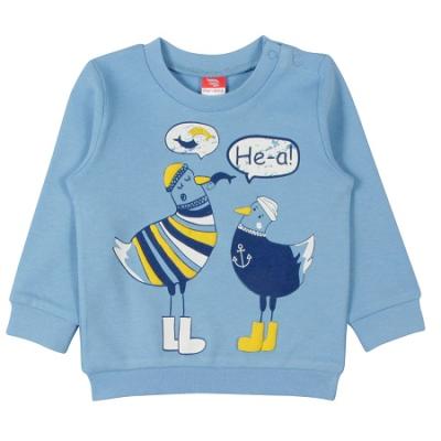 Джемпер с длинным рукавом из мягкого интерлока. По низу изделия притачной пояс, низ рукава на манжете. Горловина круглая обработана притачной планкой. Пояс, манжеты и воротник выполнены из рибаны с эластаном. В плечевом шве для удобства одевания обработана застежка на кнопки. Перед декорирован веселым принтом.Дополнительно