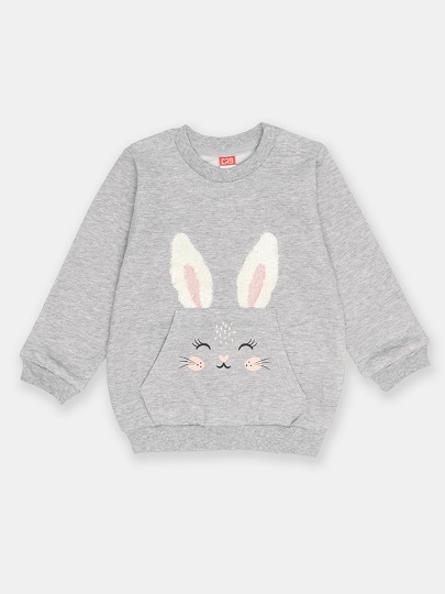 Джемпер с длинным рукавом. Притачной пояс, манжеты и бейка горловины выполнены из кашкорсе с эластаном. На плече застёжка на 2 кнопки. Спереди - карман "кенгуру", оформленный шелкографией в виде мордочки. Над карманом объемная вышивка SUZINE в виде ушек.Дополнительно